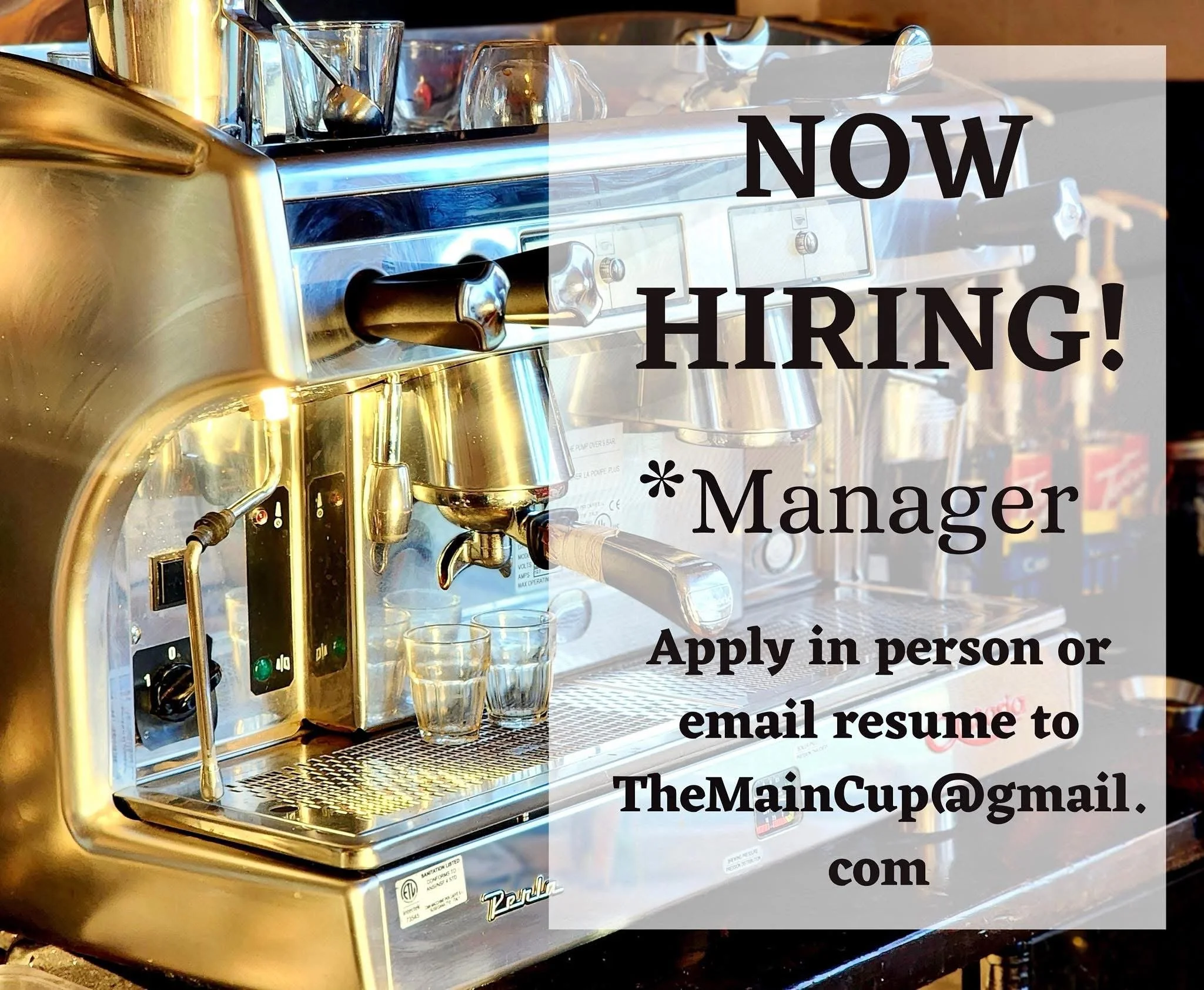 The Main Cup is closed on Sundays but is open on Monday thru Friday from 7:00 a.m. to 2:30 p.m. and Saturdays from 8:00 a.m. to 1:00 p.m. Hope to see you soon at The Main Cup!