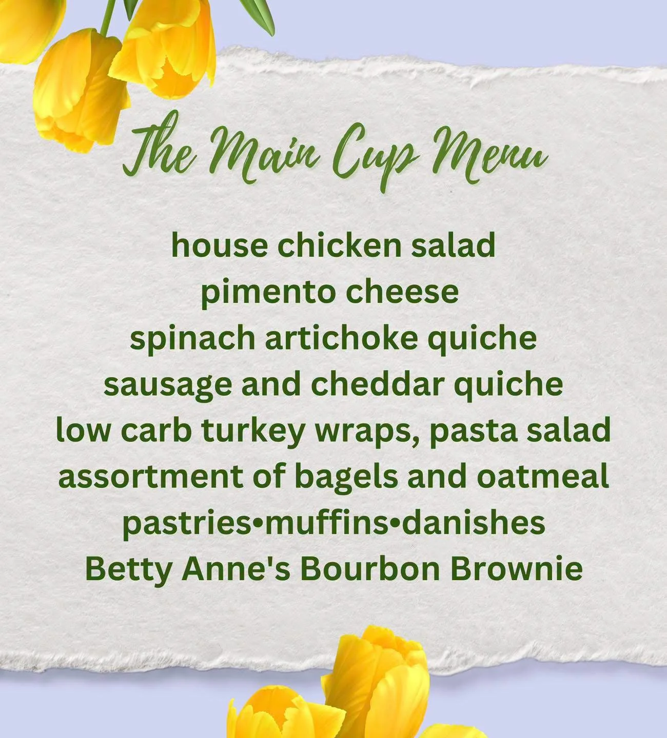 The Main Cup is closed on Sundays but is open on Monday thru Friday from 7:00 a.m. to 2:30 p.m. and Saturdays from 8:00 a.m. to 1:00 p.m. Hope to see you soon at The Main Cup!