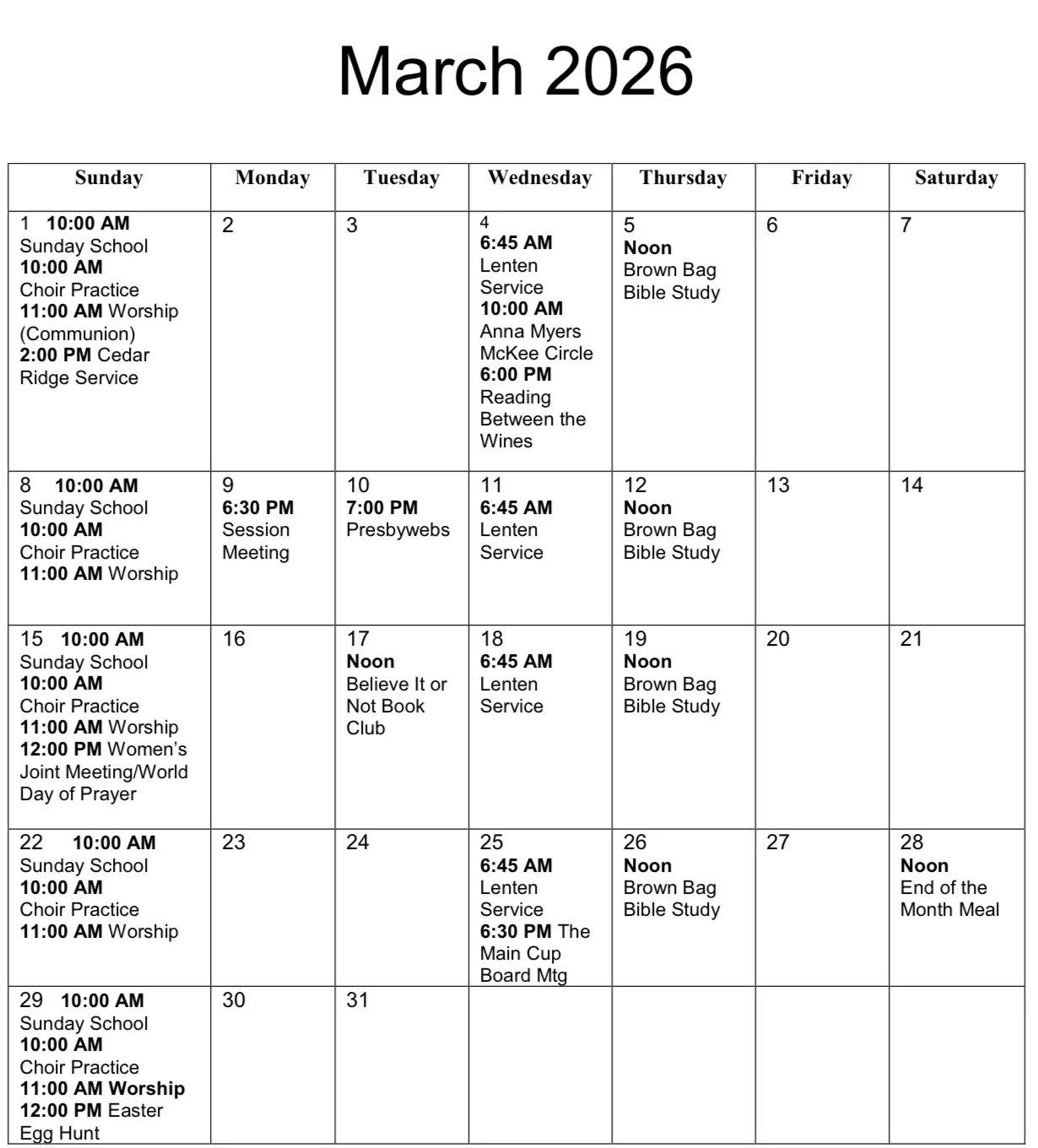 Our Cedar Ridge Service is March 1 at 2:00 PM. Please be at Cedar Ridge by 1:45 PM to visit with the “church crowd” and help pass out hymnals.