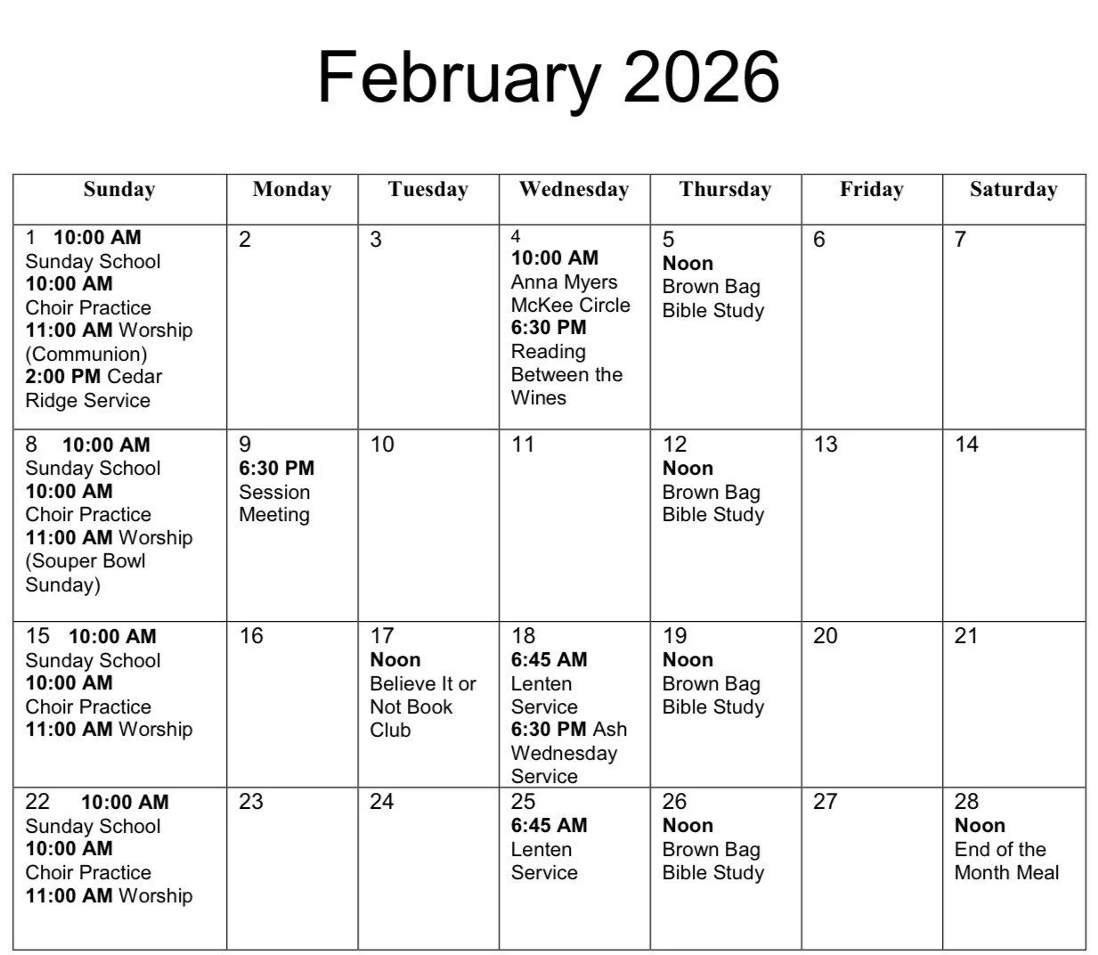 Our Cedar Ridge Service is February 1 at 2:00 PM. Please be at Cedar Ridge by 1:45 PM to visit with the “church crowd” and help pass out hymnals.