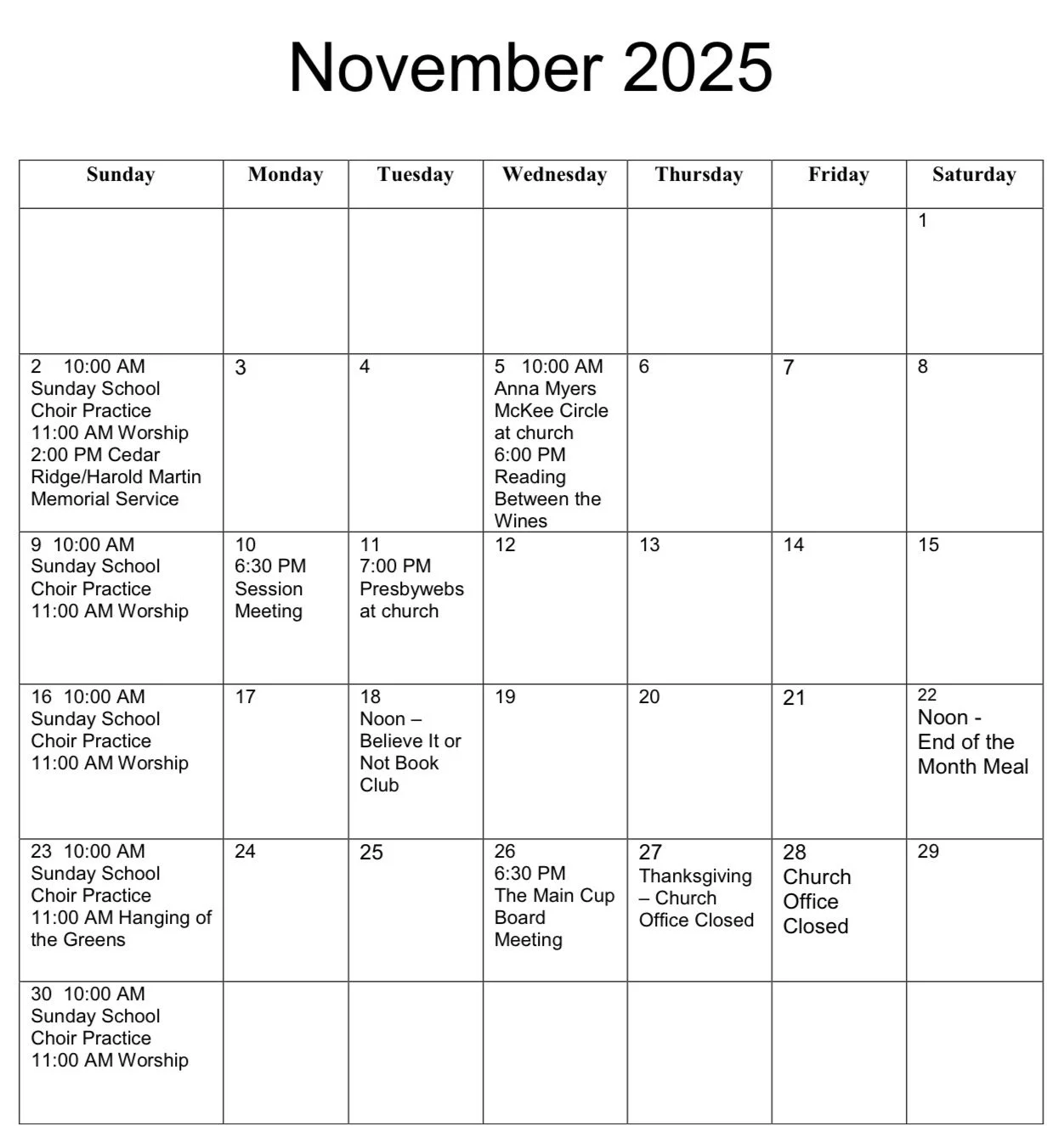 Our Cedar Ridge Service is November 2 at 2:00 PM. Please be at Cedar Ridge by 1:45 PM to visit with the “church crowd” and help pass out hymnals.